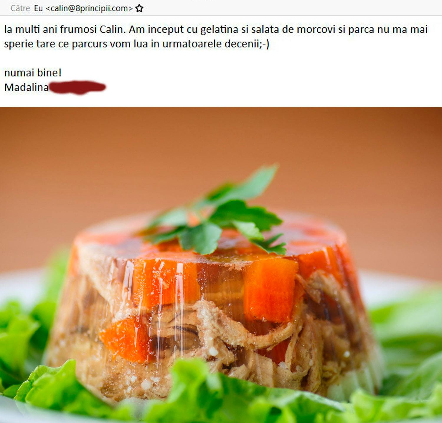 Gelatina, celălalt aliment amintit de Mădălina este un tip de proteină complet lipsită de triptofan. Cum triptofanul este un precursor al serotoninei, înlocuirea unei părți din proteina consumată cu gelatina duce la scăderea nivelului de triptofan din alimentație, respectiv al serotoninei. Dacă ai auzit invers, că serotonina este hormonul „fericirii” trebuie să citești în cartea Iarna Nu-i Ca Vara despre efectele nocive ale acestui hormon al hibernării.